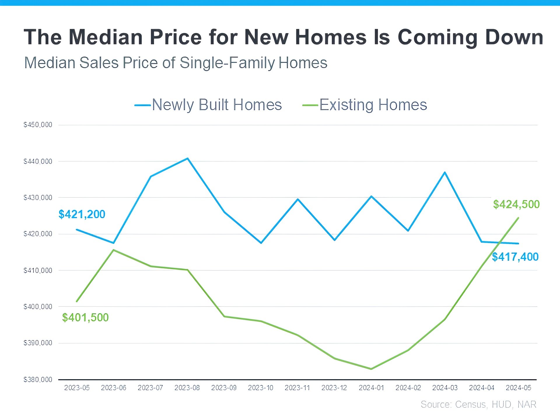 The median sales price for newly built homes is lower than the median sales price for existing homes today. This might seem surprising, but it’s true according to the latest data from the Census and the National Association of Realtors (NAR):